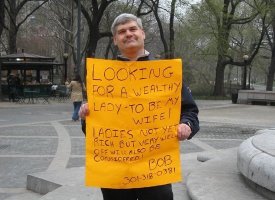 what a wacky marriage proposal. Robert Darling,56, lives in Bradley Beach, N.J., but goes to New York three times a week and holds up signs likes these in hopes of finding his future wife. He's been doing this for 10 years and has one date to show for it and she just wanted him to marry her friend for a green card please leave your comments and tell us what you think...
